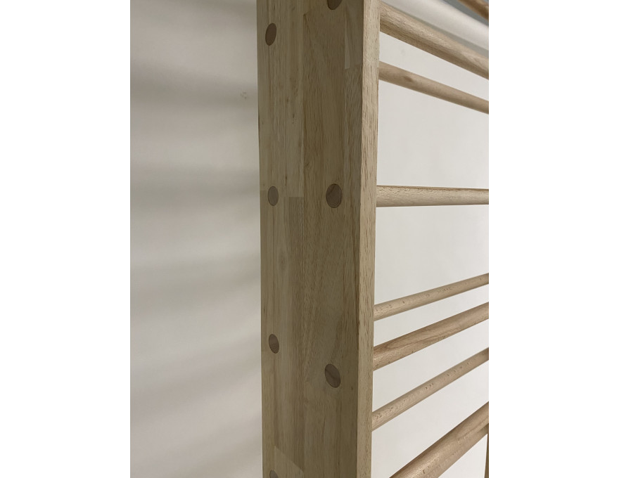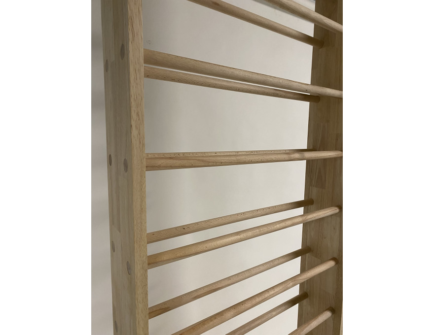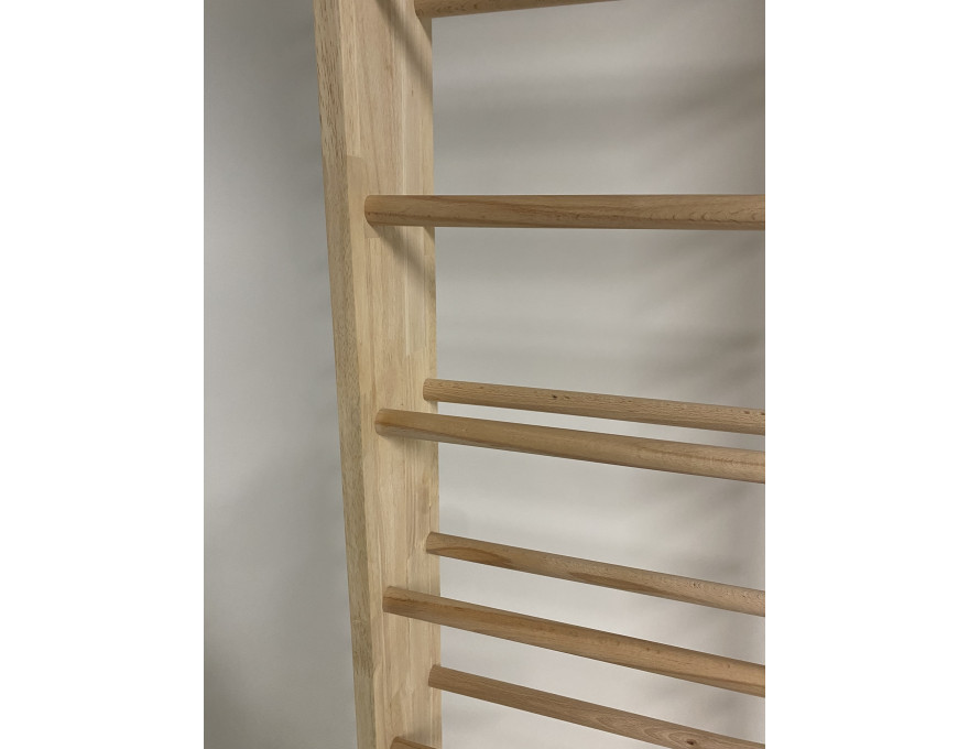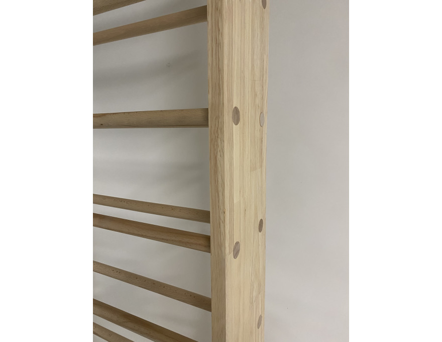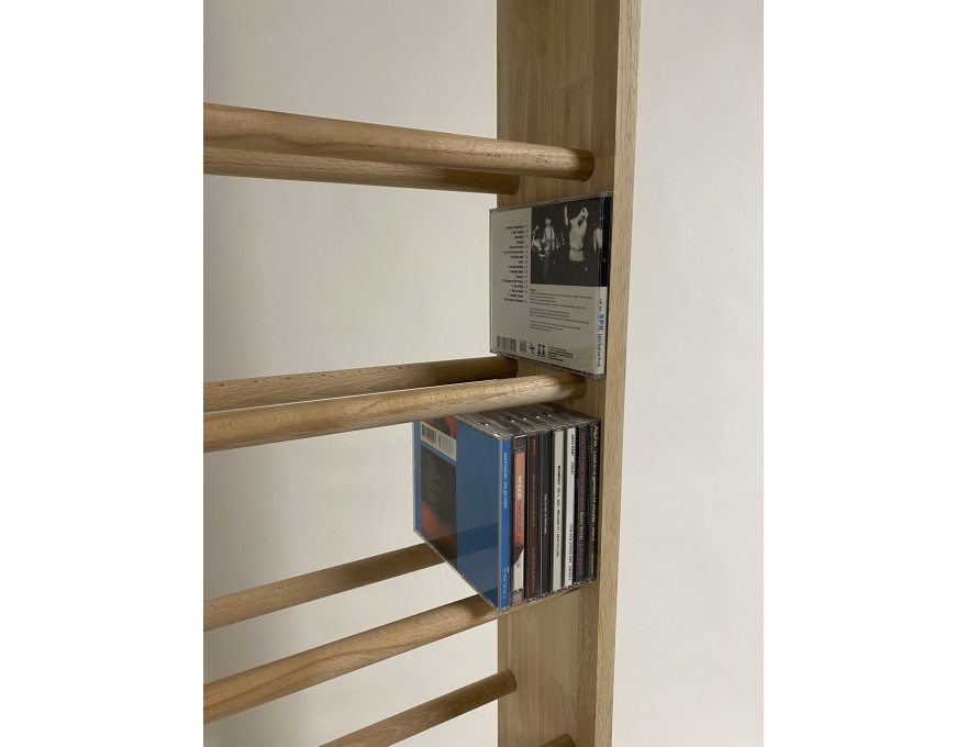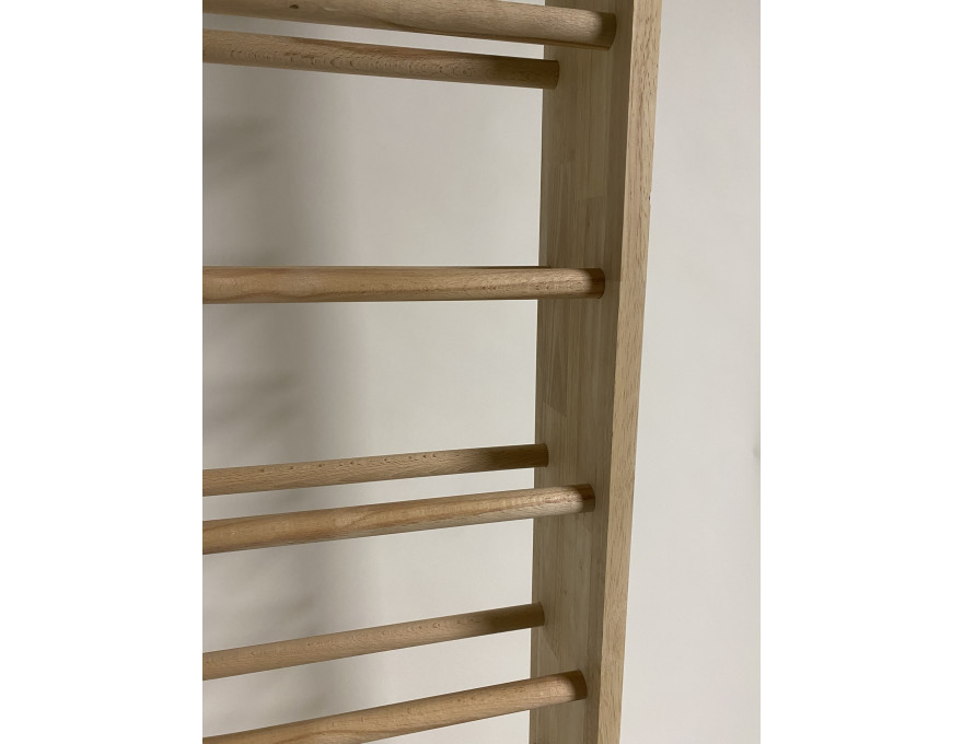 Deux montants en Hévéa massif, des tubes en bois de 20mm de diamètre simplement insérés dans les trous, bibliothèque simple, de 50cm de large, atypique et évidemment modulable.