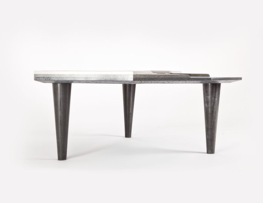 La table Fragment Béton s'inspire des tableaux de Mostapha El Oulhani. Le plateau est constitué de strates de bétons de différentes couleurs, créant un zoom dans un fragment de zellige.